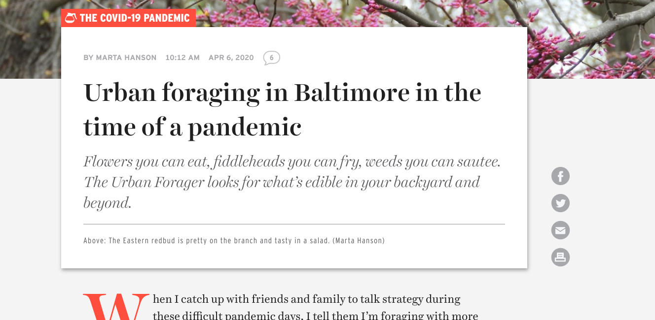 "Urban Foraging in Baltimore in the Time of a Pandemic." Baltimore Brew, Nov.2020, by Marta Hanson